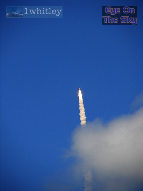 ![]() The rocket soared into the blue skies, although the Discovery shuttle was hidden here behind the main boosters. . |