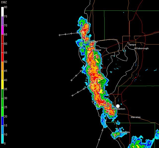 spouts, and star-spangled banners We headed out by 11am, and had a free and easy journey as far as Orlando. However, as we hit the toll roads between Orlando and Titusville, traffic started backing up as far as the eye could see. We were listening to the non-stop coverage of launch, thanks to local radio based in the Kennedy area. As the minutes before launch grew near, we were still around 14 miles south-west of the pad. It was becoming clear that we wouldn't make the ring-side seat in time. In an almost unitary decision, every car stuck on the roadway pulled off onto the grass verges simultaneously. Everybody jumped out of their cars, and gazed to the north-east horizon, where Discovery was due to launch. Laura and Bren jumped on the roof of the Jeep for a better look, as the countdown seconds commenced.... ....there it was! Discovery, with rockets attached, blasted into the clear-blue skies. It was over a minute before the roar of the thrusters reached us, but it was amazingly loud nonetheless. We grabbed some pleasing footage and photos of the launch, then joined the queues heading back westwards across the state. On the return journey, we travelled westwards through a convergence line lying through the spine of the state, and this gave some torrential showers. However, little did we know, an upper trough would interact with this convergence line, sparking a uniform line of violent thunderstorms that would head westwards towards our base in Bradenton, near Tampa. We arrived home in time to see Italy put two goals past Germany in just two minutes, and then turned our attention to the skies. To our north, the sky was ink-black, and a huge gust front moved slowly towards us. Thunder boomed around, and we decided to cross the street to get a better view. We were then treated to an awesome view of cloud structure and CG lightning. If they weren't enough, a small area of cloud base started rotating. Within seconds, this pulled tight into a cone, and a huge funnel was formed. At times, this stretched over half way between the cloud and the ground. We estimated that it was over the waters of Tampa Bay, and it may well have touched down without condensation funnel. In fact, minutes later a warning was put out from the National Weather Service, confirming that a waterspout had been sighted from the same storm. Here is the warning: BULLETIN