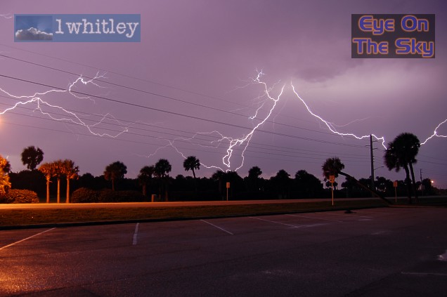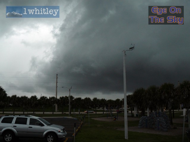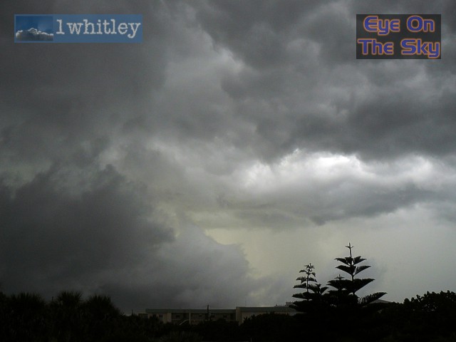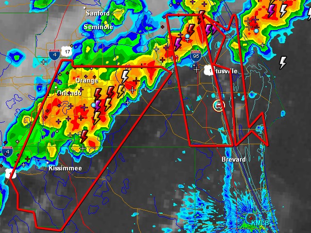 Radar grab showing our location, south of Titusville, within the Severe Thunderstorm Warning. The line of storms was moving east towards the coast. The west coast sea breeze boundary can be seen in the bottom-right of the image, stretching southwards through Brevard County towards Melbourne. Radar from GRLevel3. . |